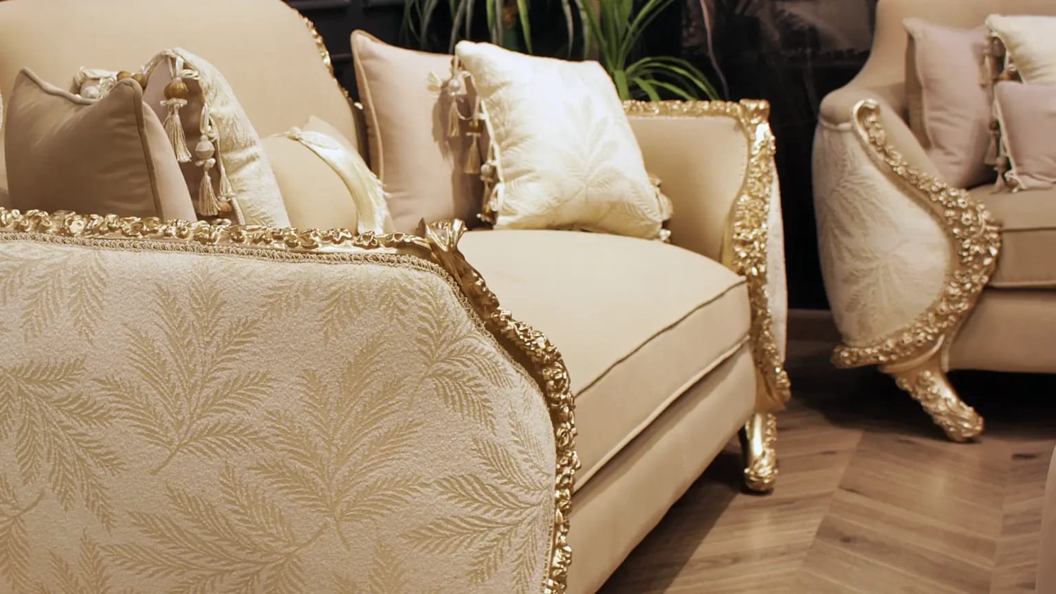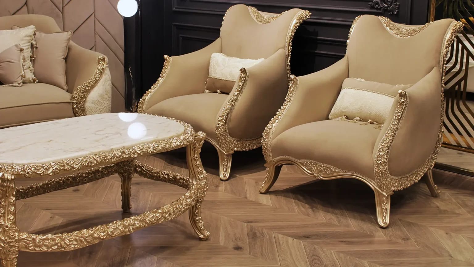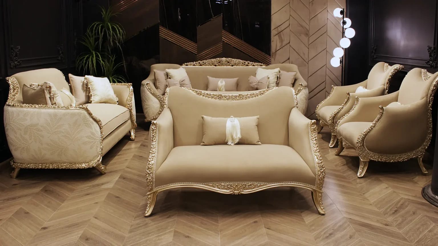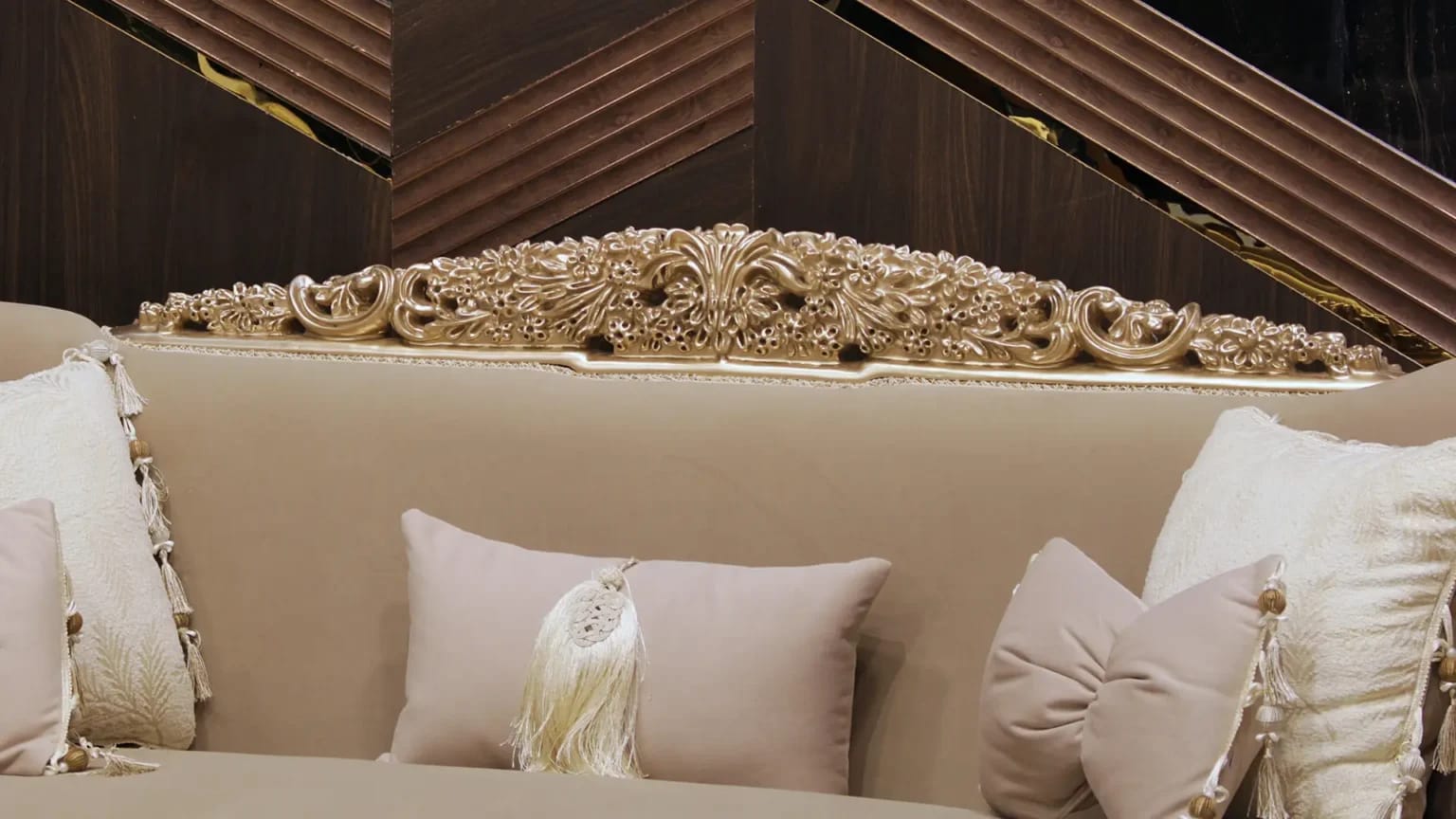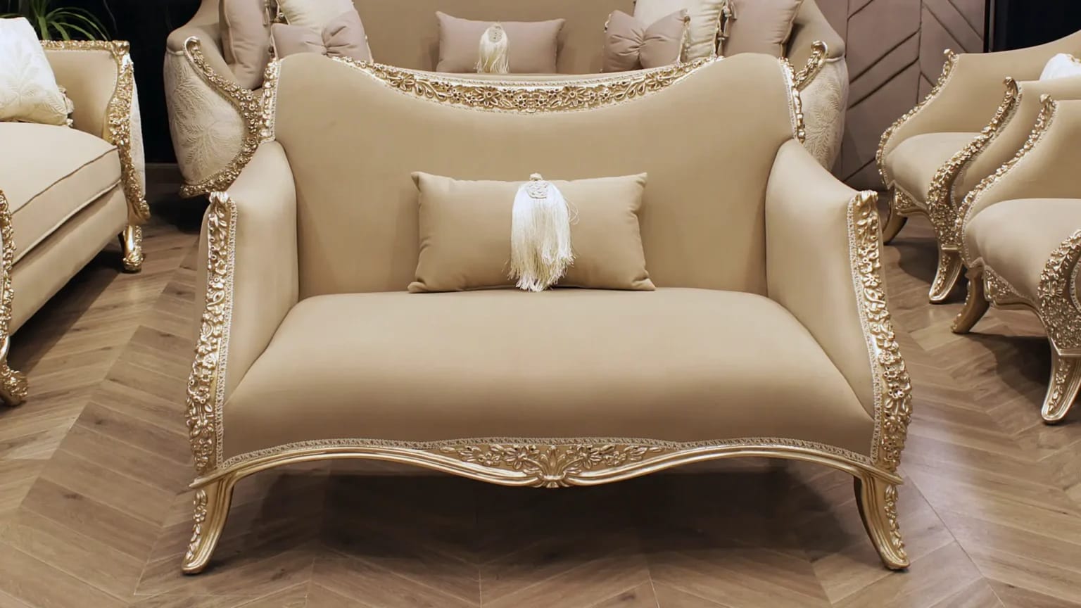 الصالون معمول من خشب زان روماني أحمر تقيل وقوي، النوع اللي يعيش سنين ويستحمل الاستخدام من غير ما يتأثر، ويدي إحساس بالفخامة والثبات من أول مرة تشوفه.