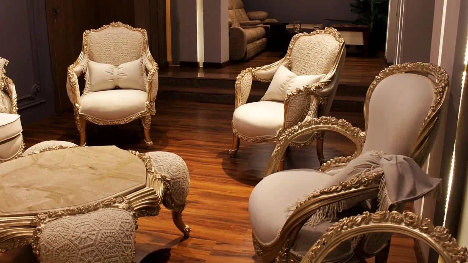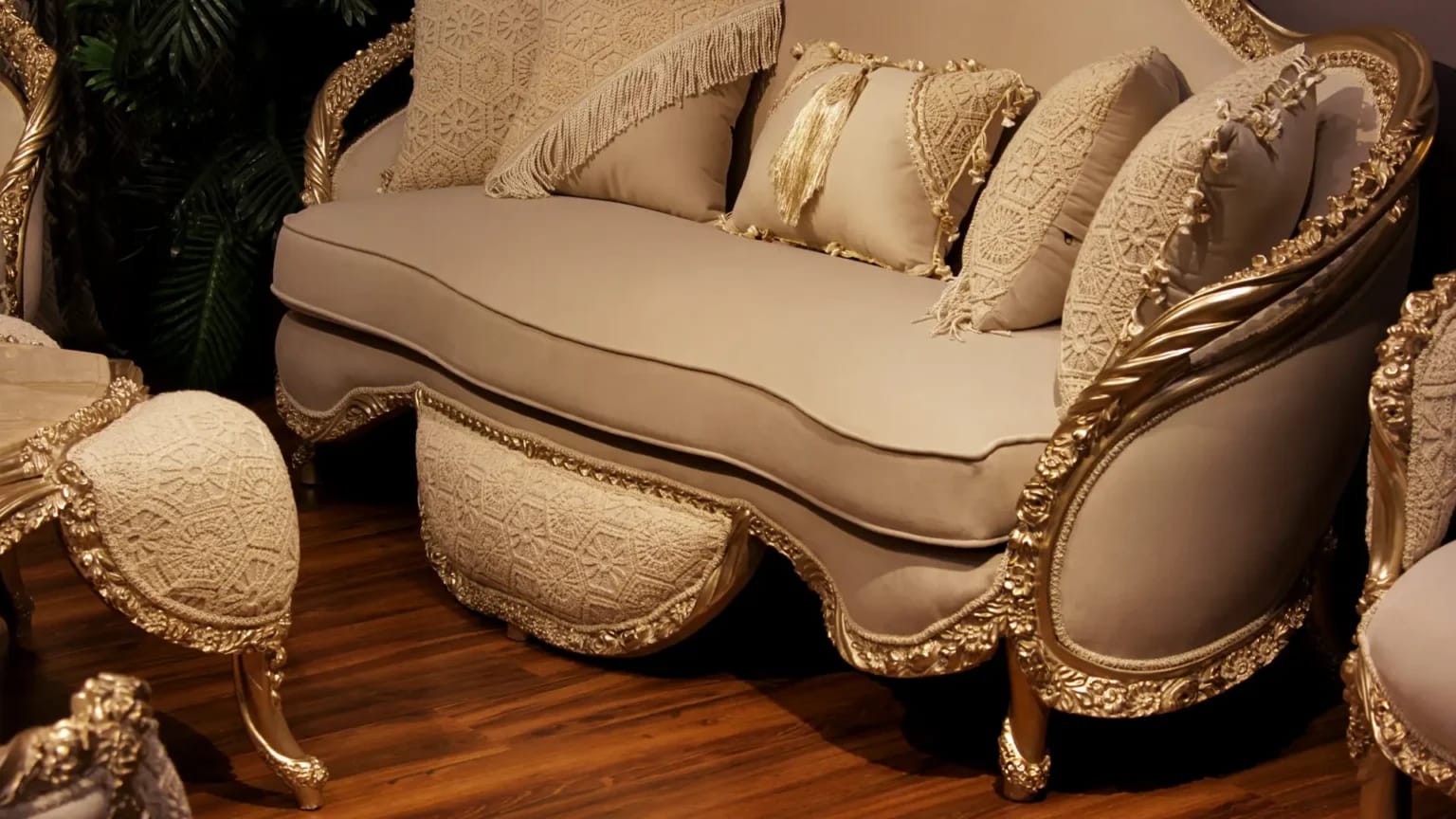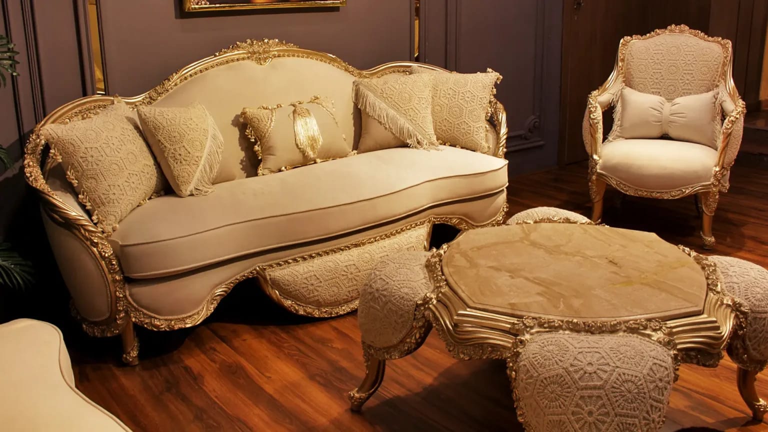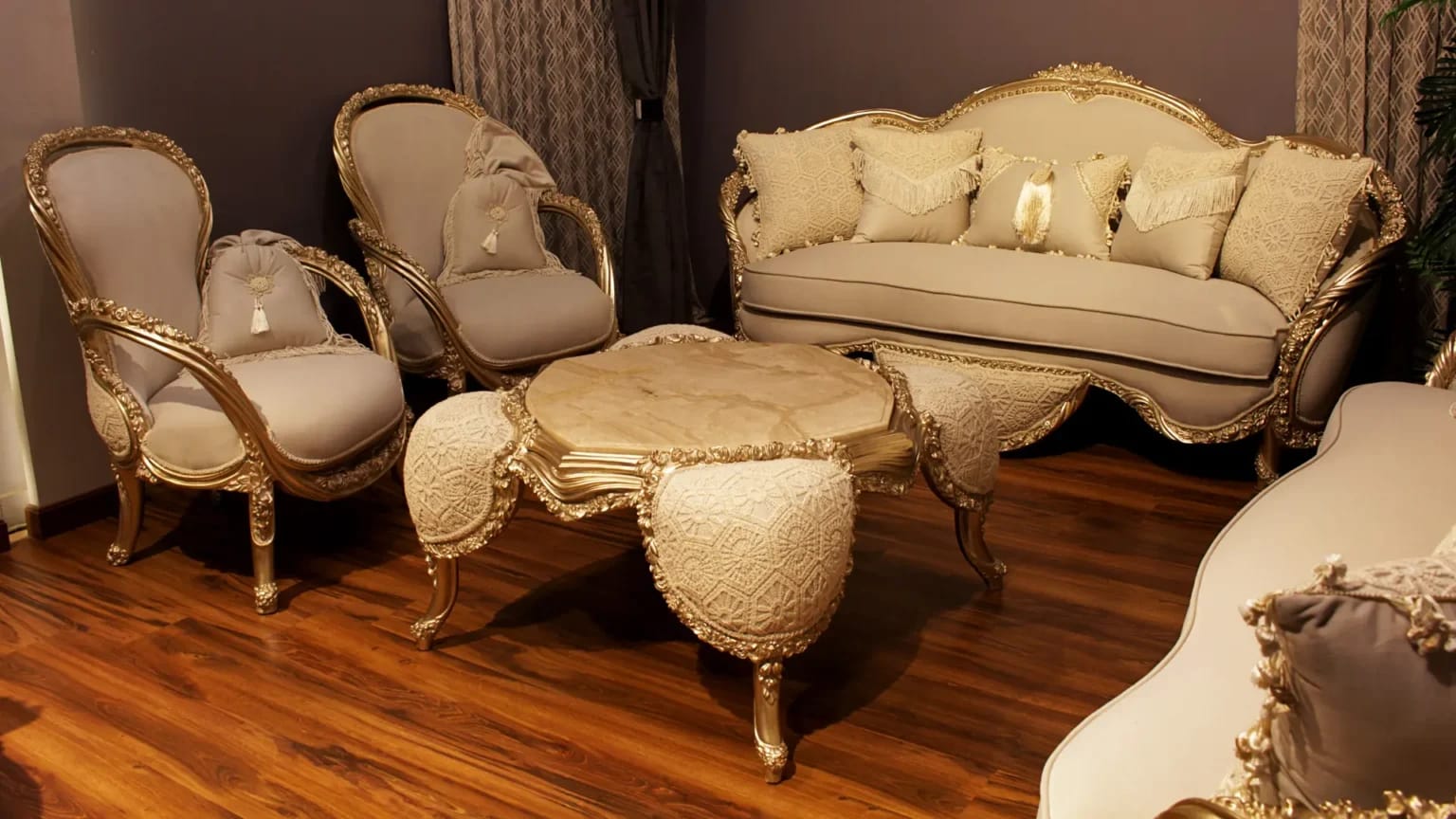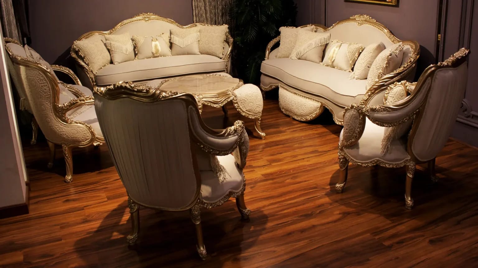 الصالون معمول من خشب زان روماني أحمر تقيل وقوي، النوع اللي يعيش سنين ويستحمل الاستخدام من غير ما يتأثر، ويدي إحساس بالفخامة والثبات من أول مرة تشوفه.