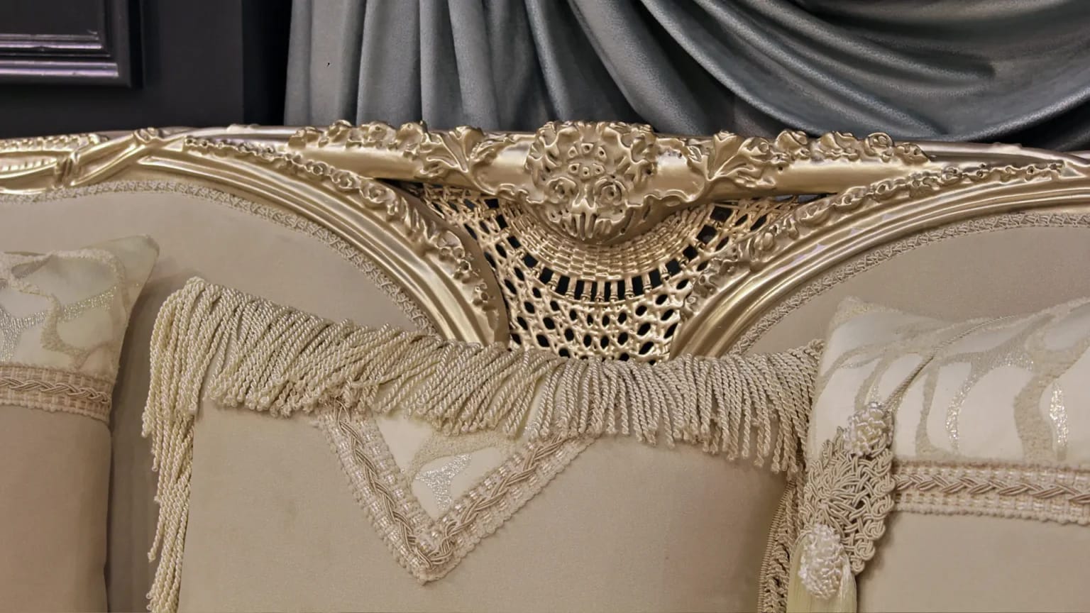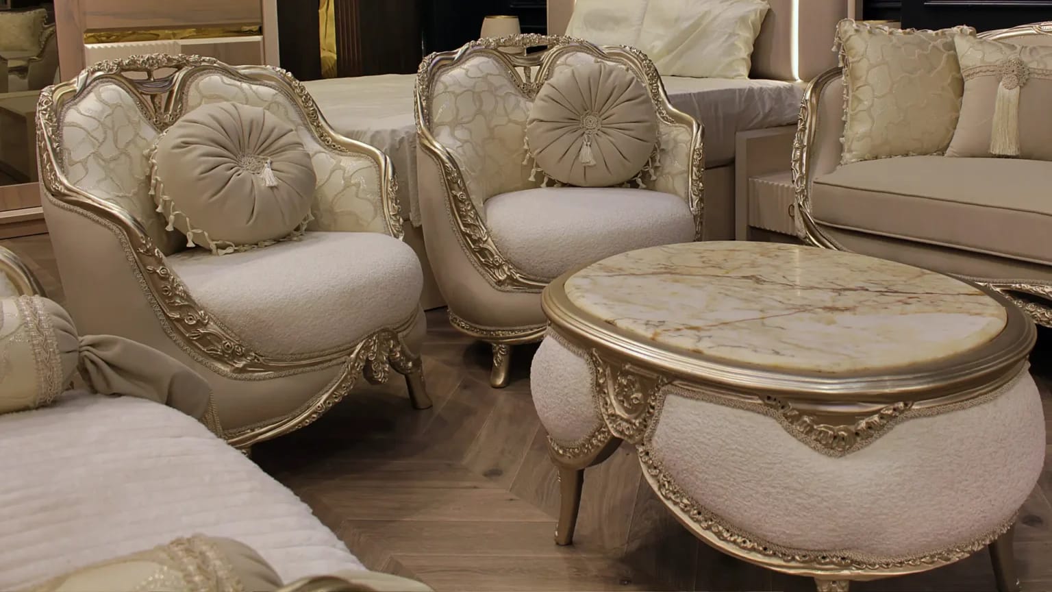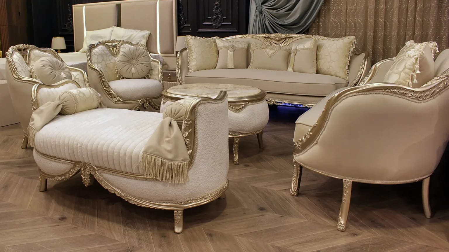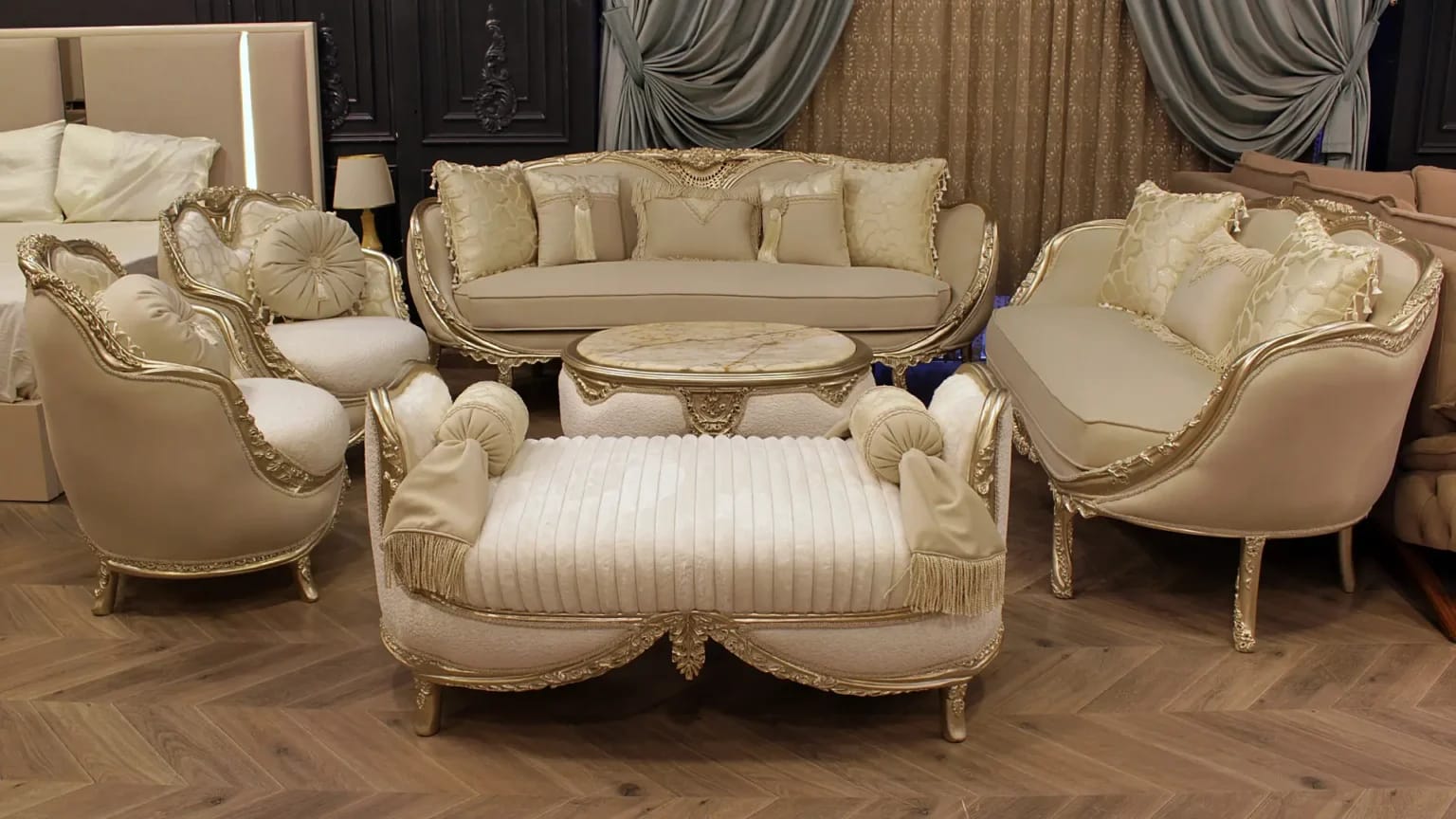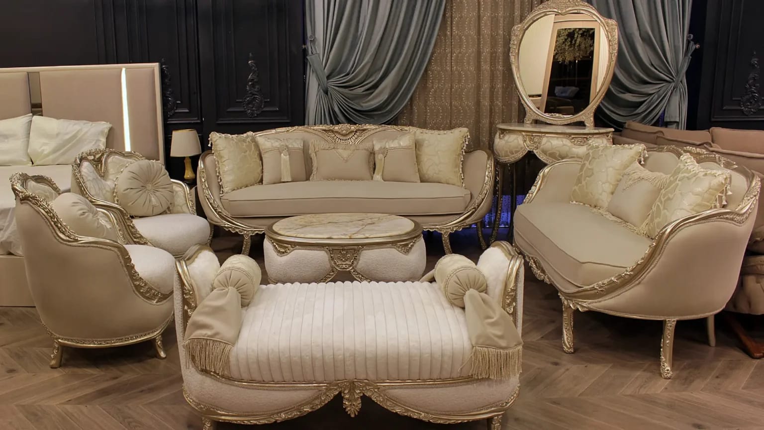 الصالون معمول من خشب زان روماني أحمر تقيل وقوي، النوع اللي يعيش سنين ويستحمل الاستخدام من غير ما يتأثر، ويدي إحساس بالفخامة والثبات من أول مرة تشوفه.
