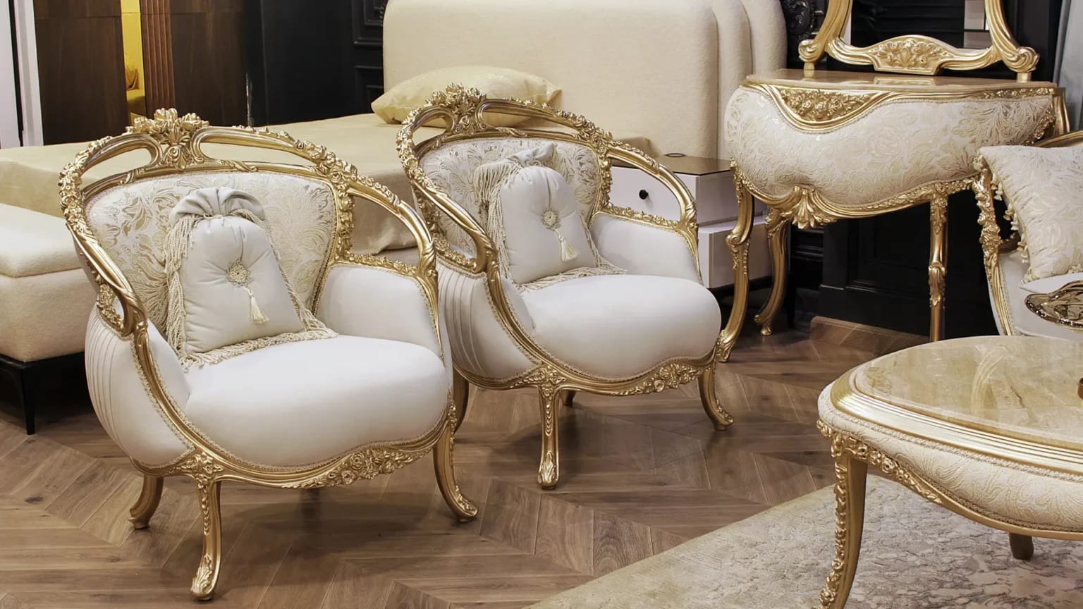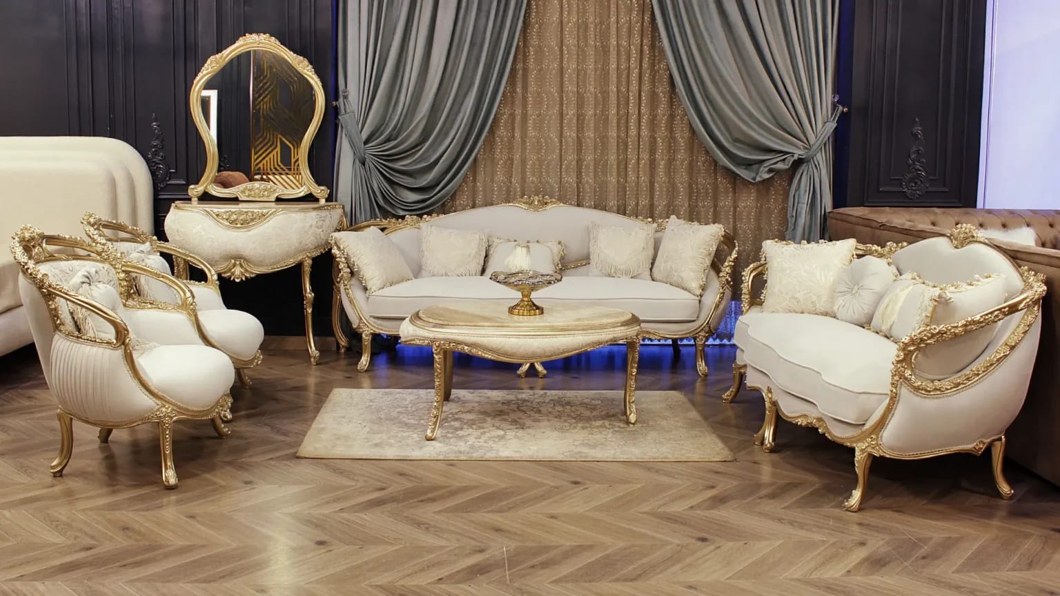 الصالون معمول من خشب زان روماني أحمر تقيل وقوي، النوع اللي يعيش سنين ويستحمل الاستخدام من غير ما يتأثر، ويدي إحساس بالفخامة والثبات من أول مرة تشوفه.