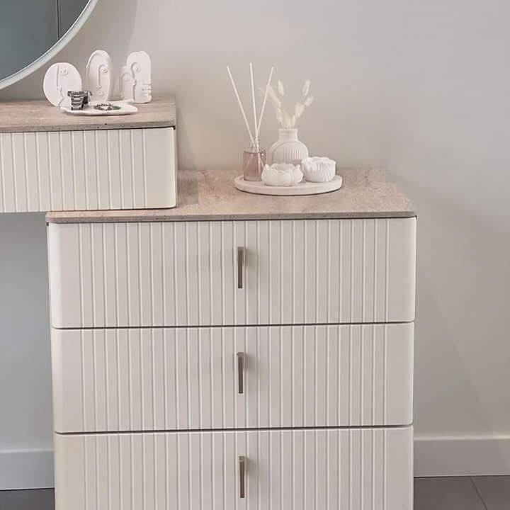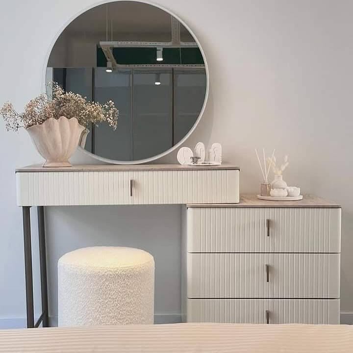 🪞 تسريحة 120 سم مع مرآة بلورية تعكس الضوء وتضفي إحساسًا بالرحابة والبهجة. مساحة مثالية لروتينك اليومي.